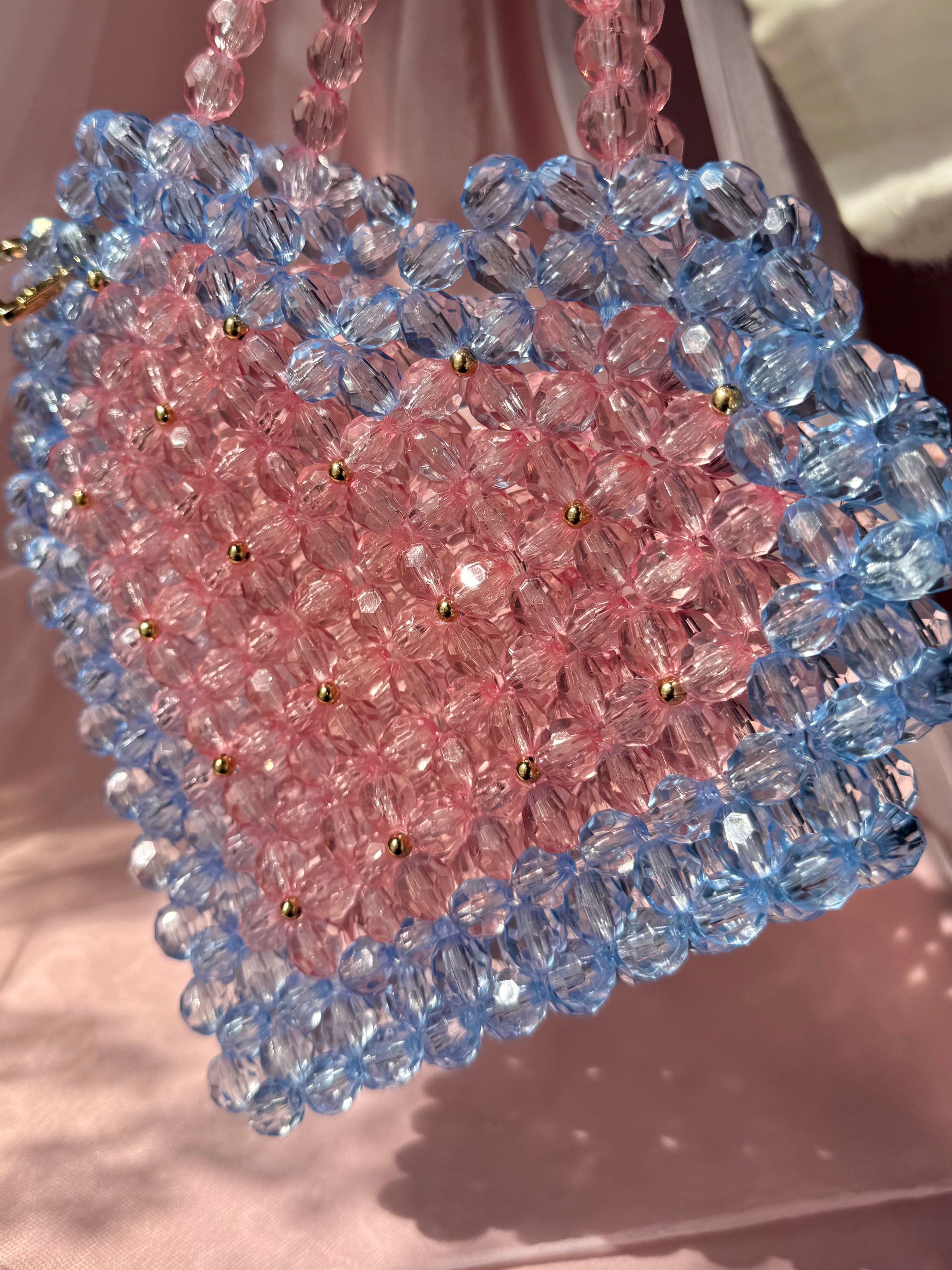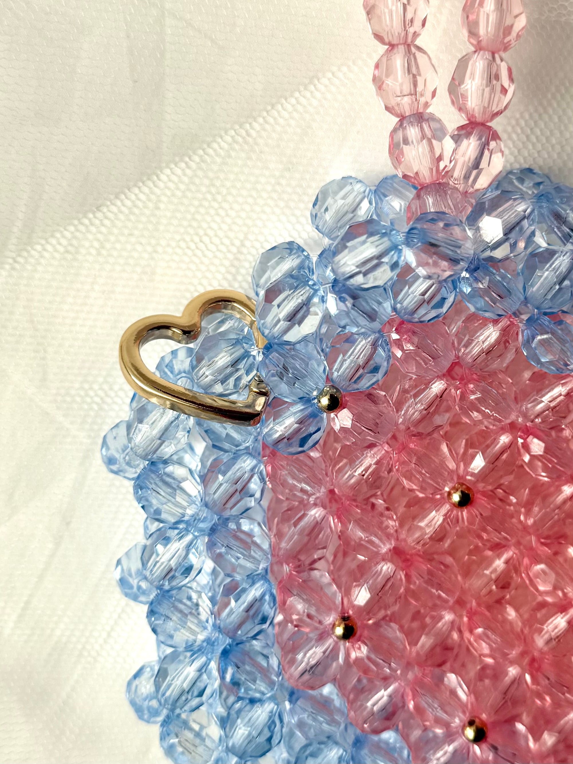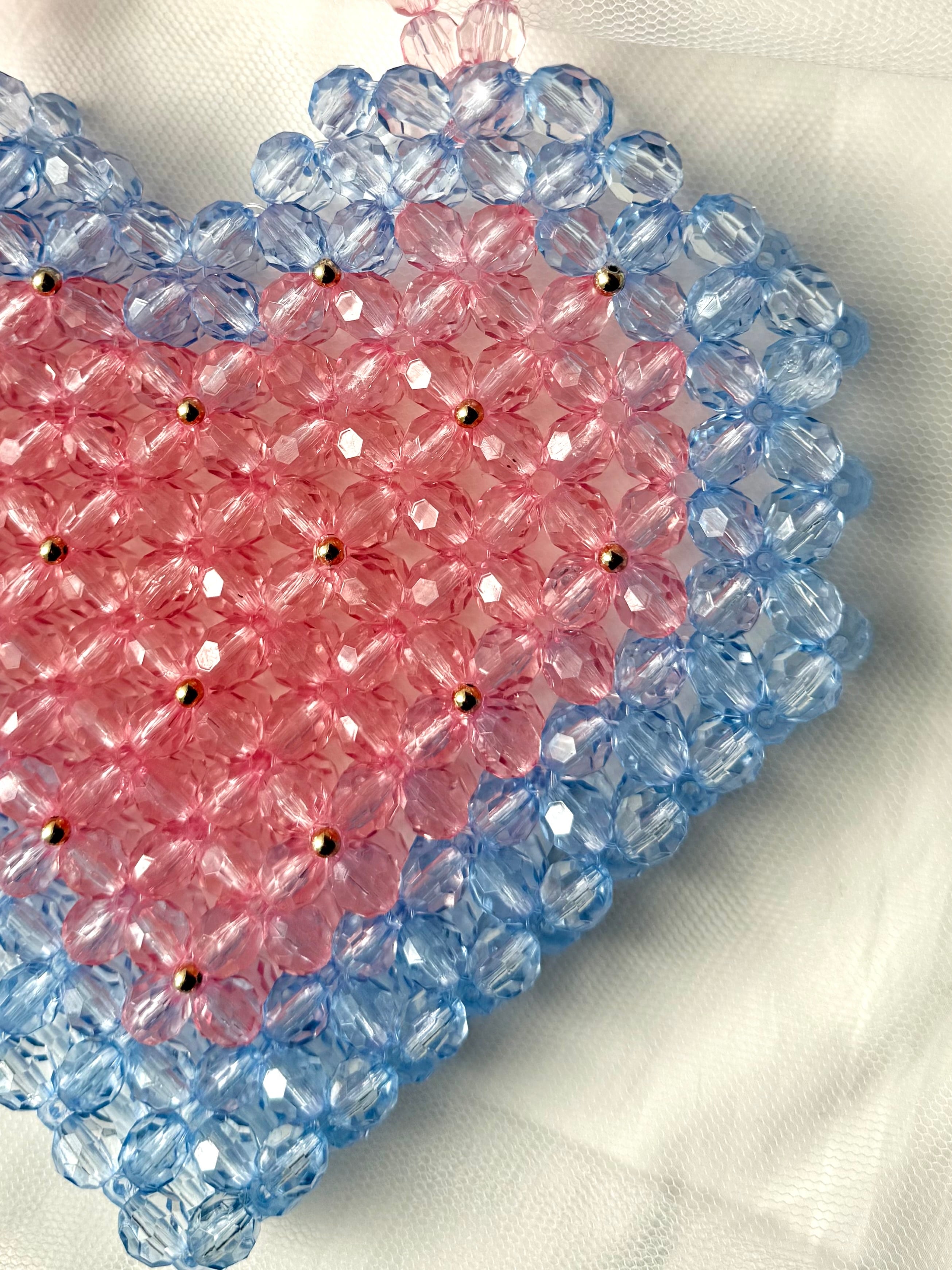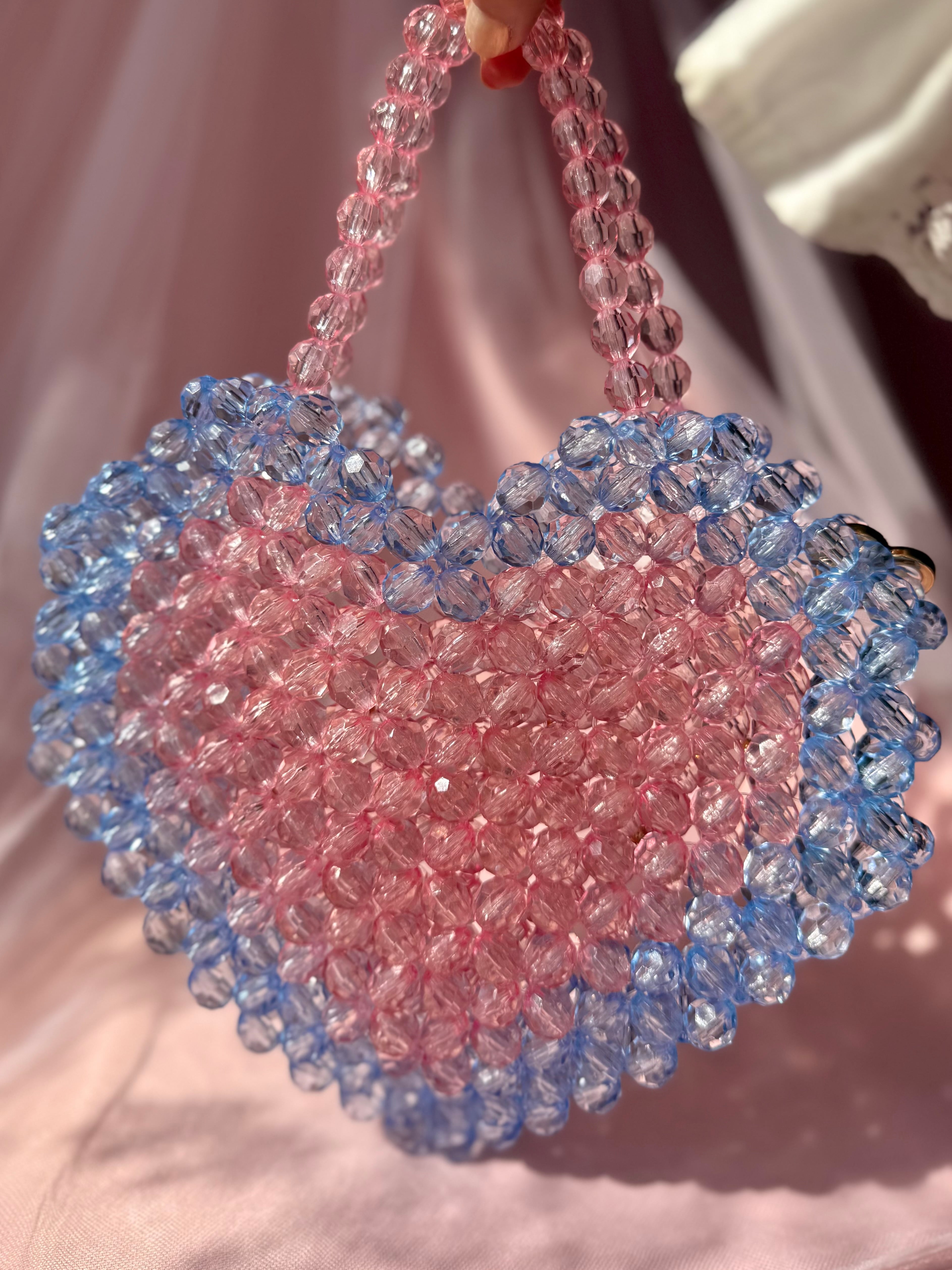 色 : ライトピンク・ライトブルー サイズ : (取手除いて)縦21.5㎝×横23㎝×マチ2.5㎝ 取手約26㎝です。 ※素人採寸の為、若干の誤差がある場合がございますが予めご了承頂けますと幸いです。 状態 : 新品 注意事項 ※ハンドメイド作品になります。 大好きなハートのビーズバッグ♡大好きな色の組み合わせ、ピンク×水色で作りました。お友達や周りの方から「何そのバッグかわいい〜♡!」と言ってもらえたら幸せです笑♡
