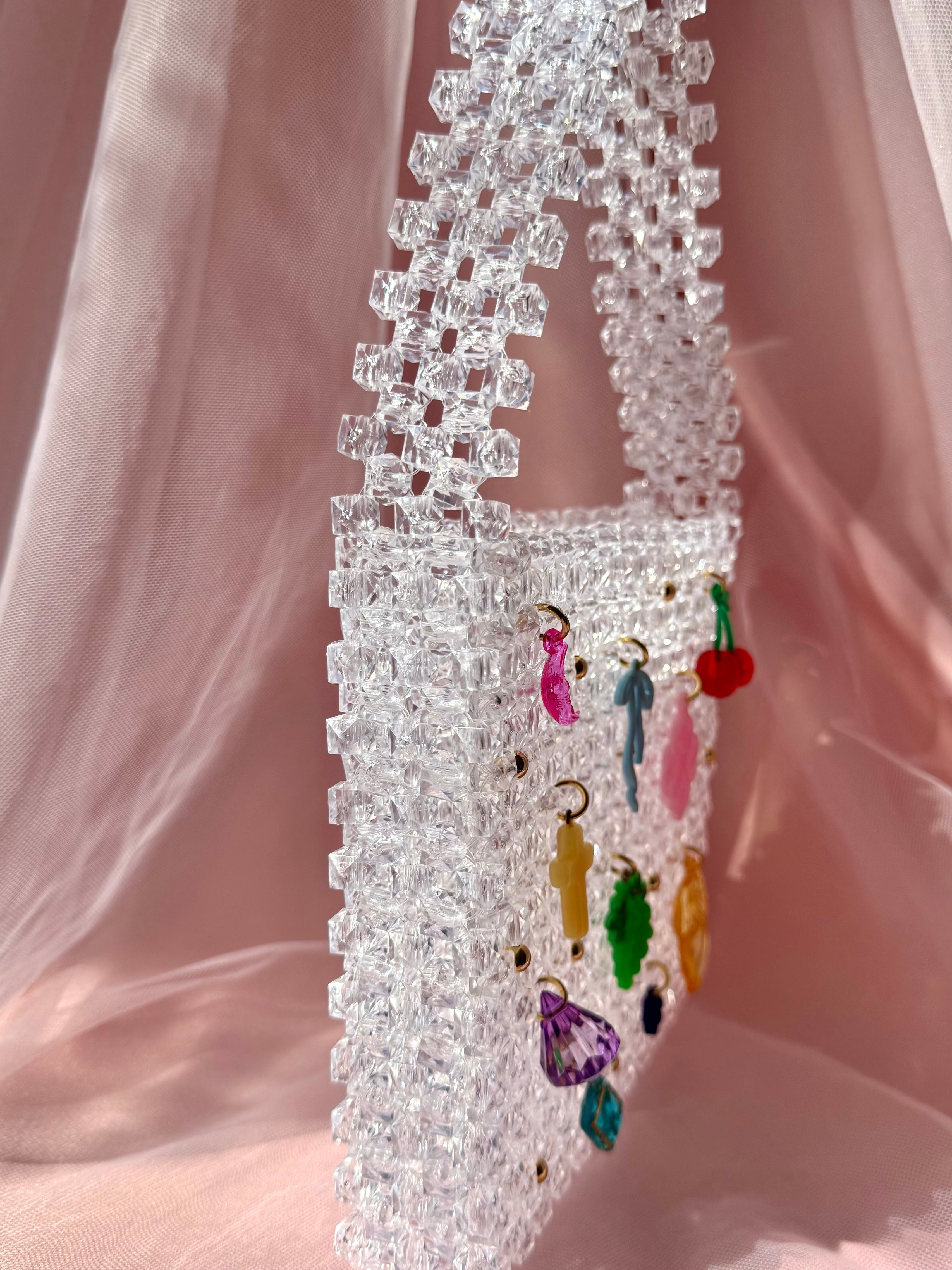 色 : クリア・〈チャーム〉マルチ サイズ : (取手除いて)縦15.5㎝×横16.5㎝×マチ3.5㎝ 取手約31.5㎝です。 ※素人採寸の為、若干の誤差がある場合がございますが予めご了承頂けますと幸いです。 状態 : 新品 注意事項 ※ハンドメイド作品になります。 チャームをたくさん付けて、さらにゴールドビーズでおめかしして、かわいく仕上げたビーズバッグ✧✦とってもお気に入りです◎ チャーム付きのクリアバッグは今回3種類あるので、お気に入りの物を見つけてみてください♡